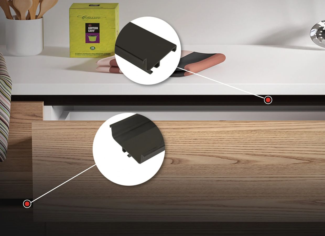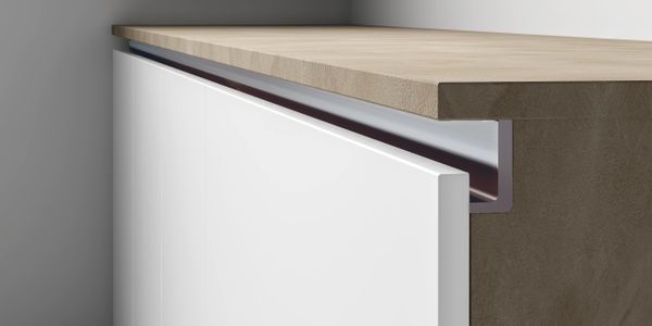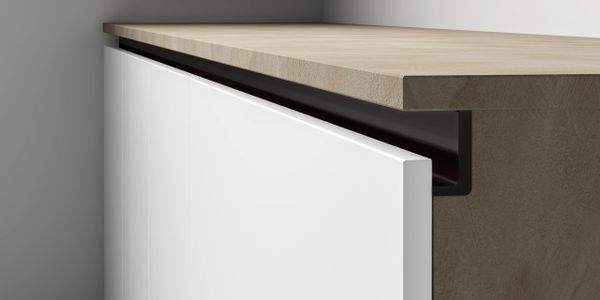 This L-Shape Profile for Under Countertops rests between a countertop and the top drawers, creating consistent spacing between each layer. This channel provides easy finger access above the drawer front for easy opening.