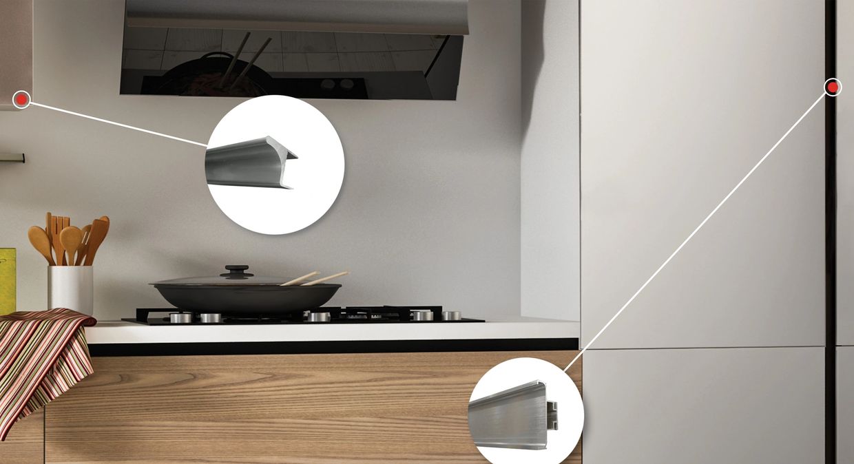 European inspired aluminum profile designed for contemporary kitchens. Creating a designer-friendly separation between cabinet doors, pantry doors, and drawer levels, and provides on-trend alternative to standard decorative handles and knobs.
